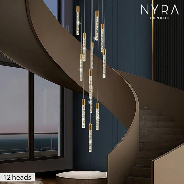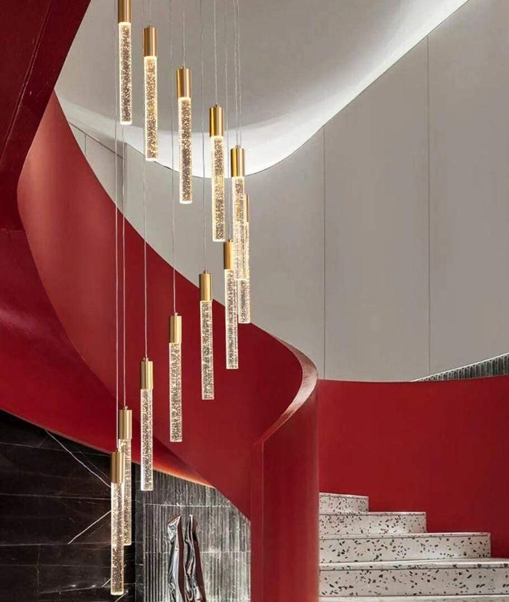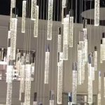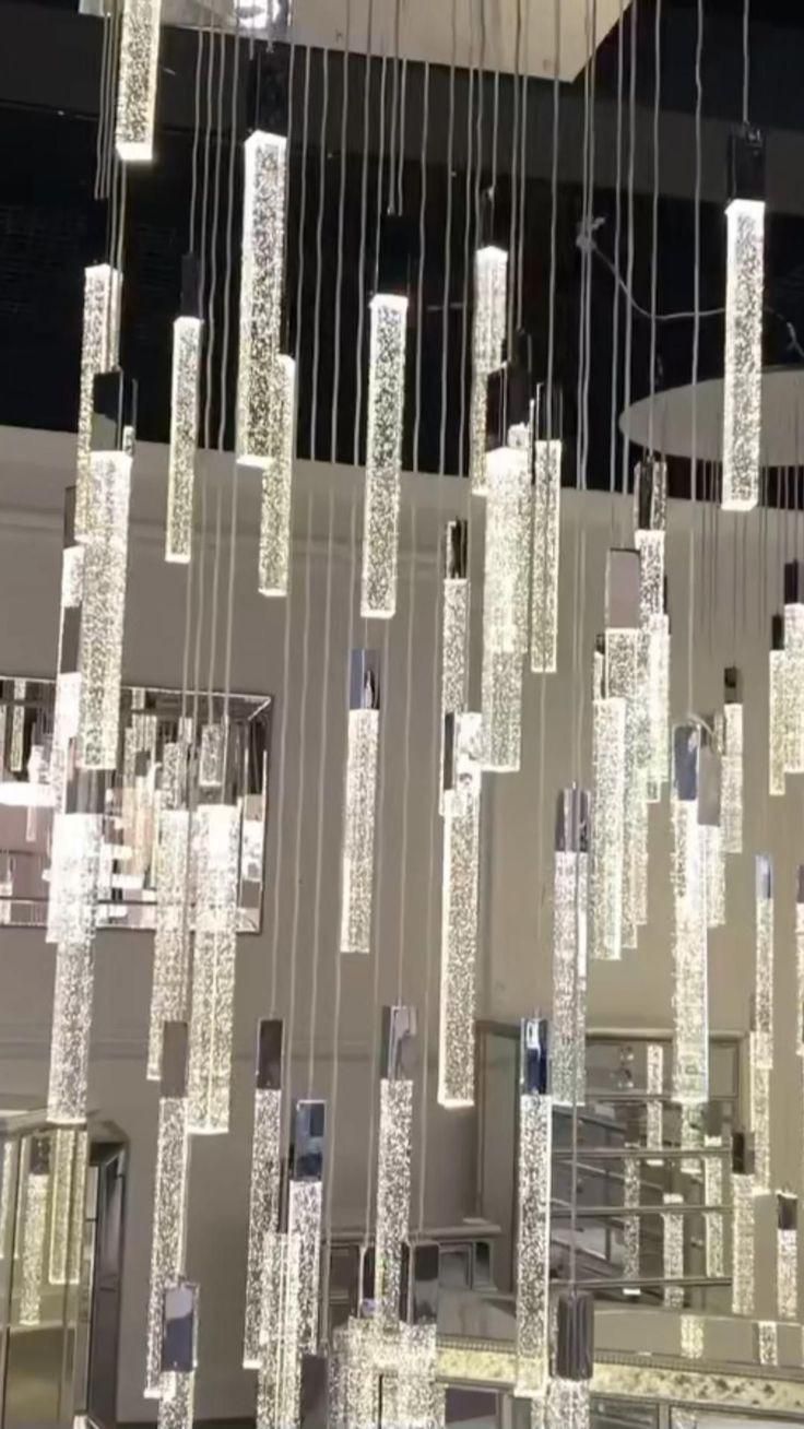 در این لوستر مدرن، چند شاخهی عمودی کریستالی به صورت آویز از سقف آویزان شدهاند. هر شاخه به شکل استوانهای با ارتفاع ۳۰ سانتیمتر و قطر ۳ سانتیمتر طراحی شده و داخل آن حبابهای ظریف کریستالی تعبیه شدهاند که در زمان روشن شدن، نور را به شکلی درخشان و چشمنواز در فضا پخش میکنند.