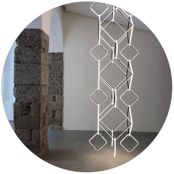 این لوستر از ۷ مربع با ابعاد 20 و 40 سانتیمتر تشکیل شده که به صورت زنجیرهای و منظم آویز شدهاند.