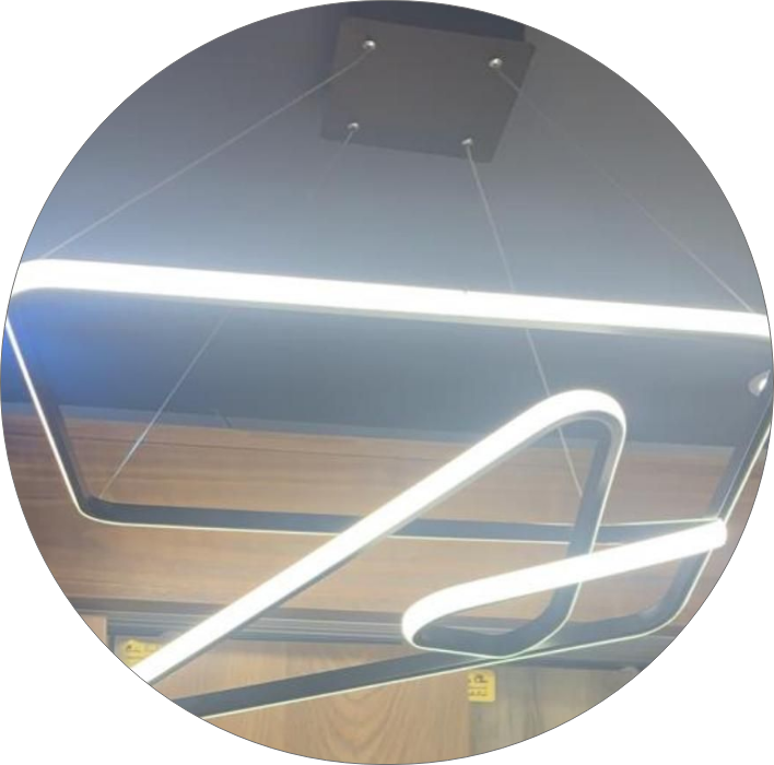 لوستر مدرن سقفی مستطیل فضایی با ریسه های اس ام دی با قطر 50سانت جنس بدنه آلومینیوم ضخیم رنگ بدنه رنگ کوره ای درجه یک در رنگهای آفتابی نچرال یخی  دهنه کار با سیلیکون نسوز میباشد رنگ بدنه مشکی طلایی میباشد مناسب اتاق خواب پذیرایی حال محیط اداری ارتفاع از سقف قابل تنظیم